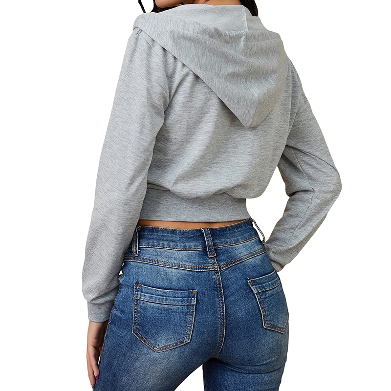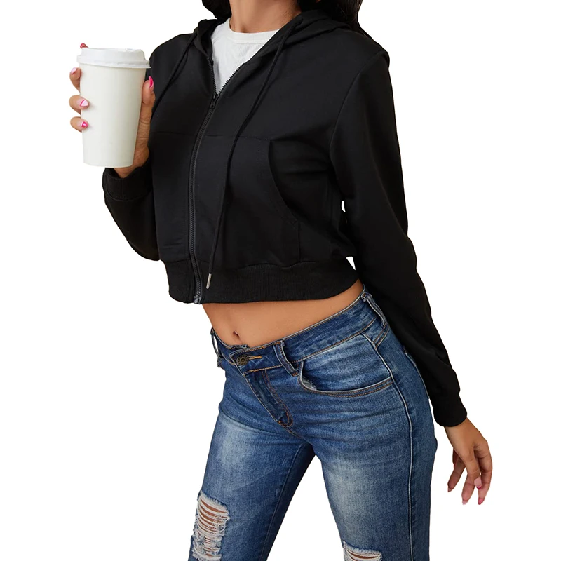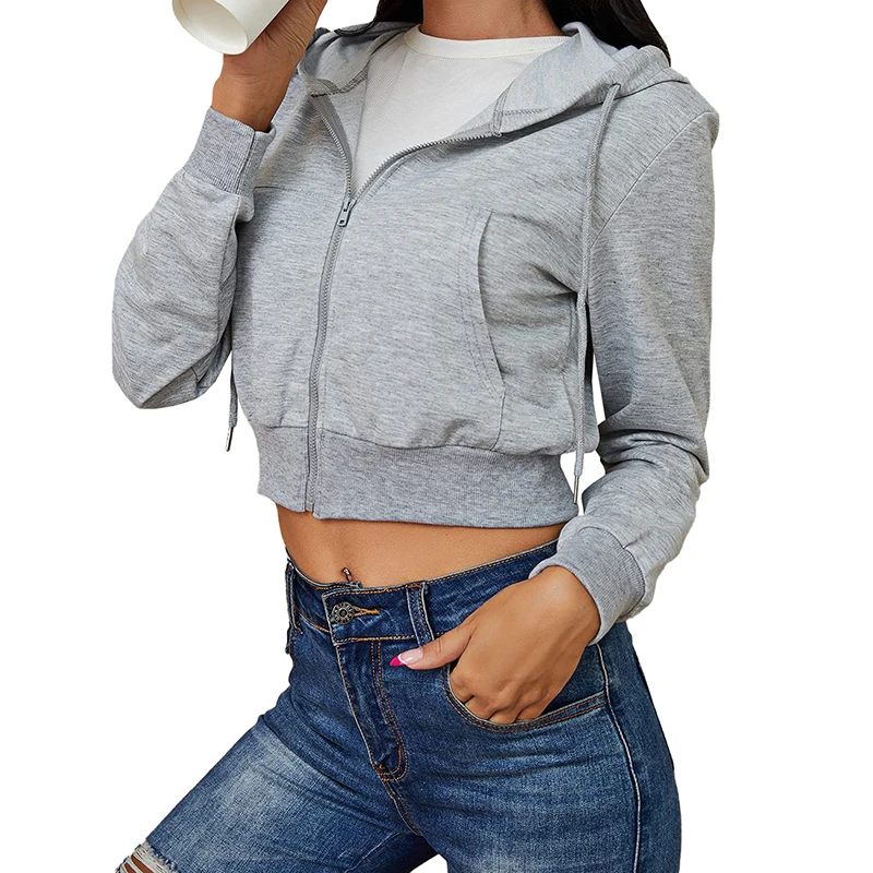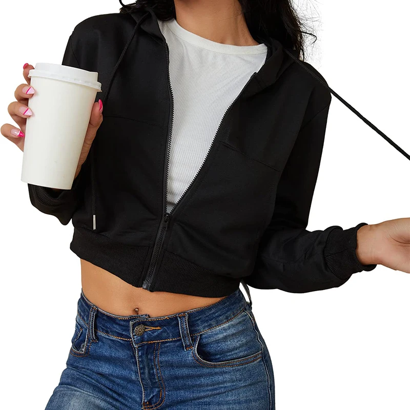 Zipper, hood, drawstring, short length, long sleeves and pockets.