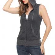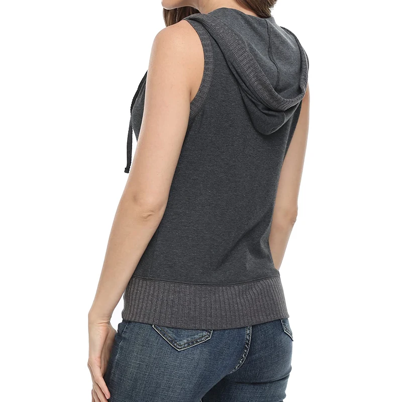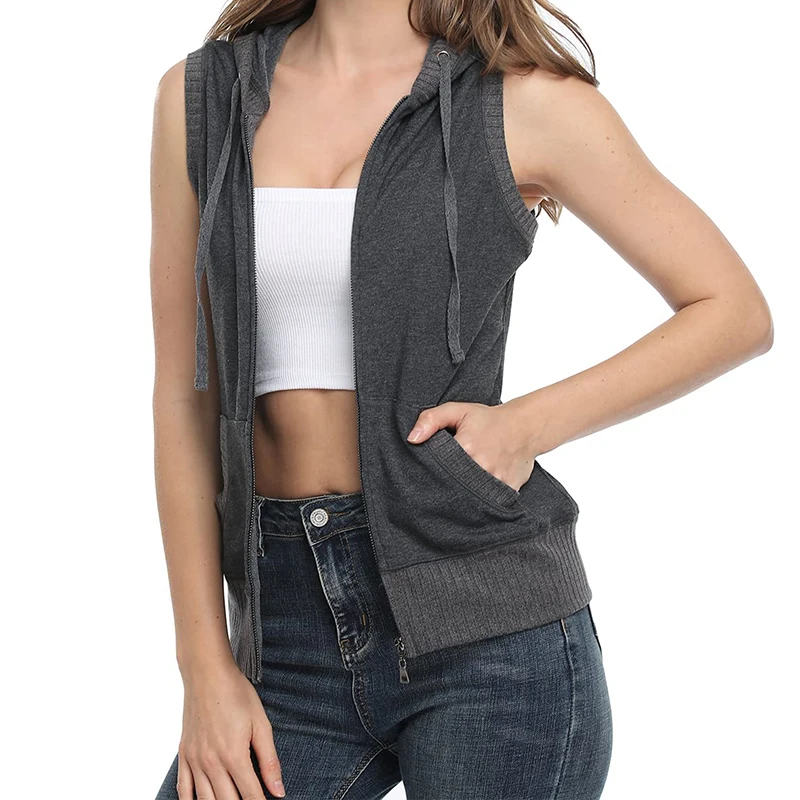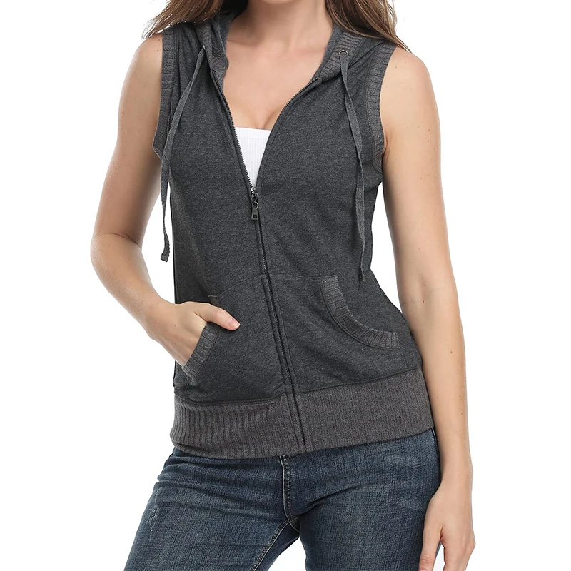 Adjustable drawstring hood, deep front pockets, ribbed sleeveless.
