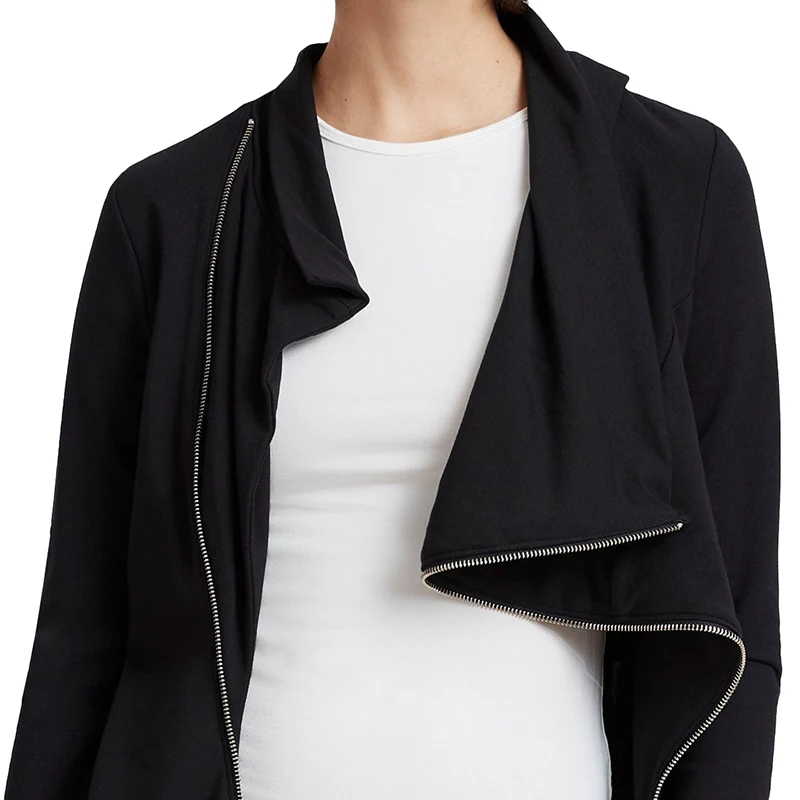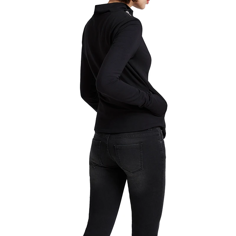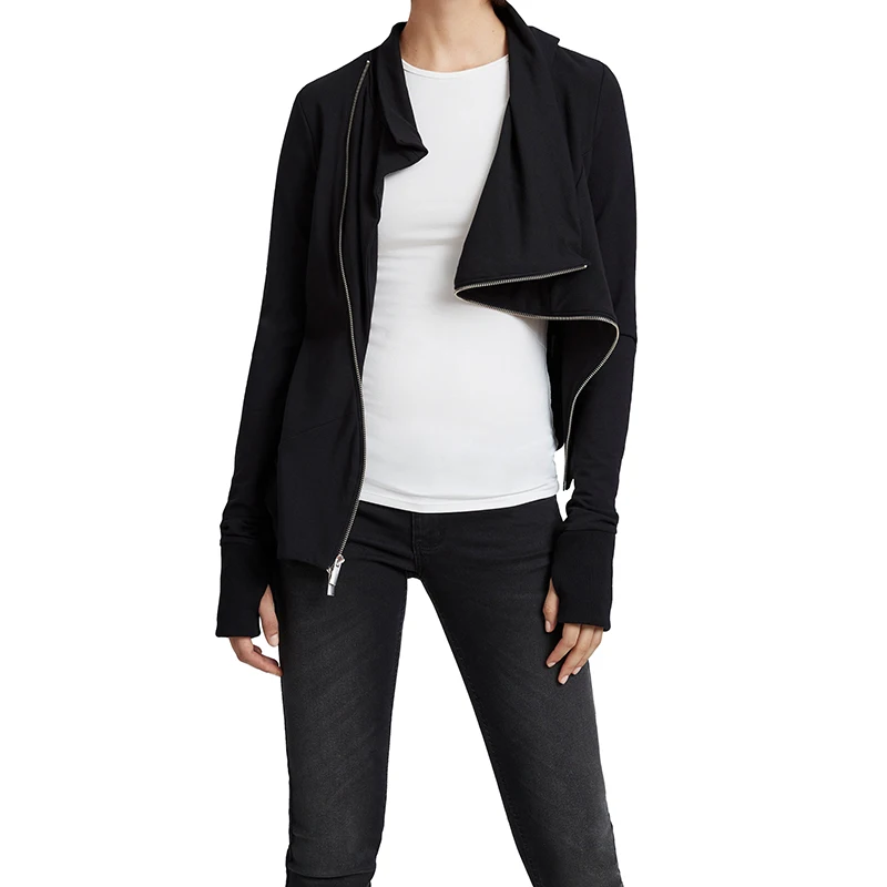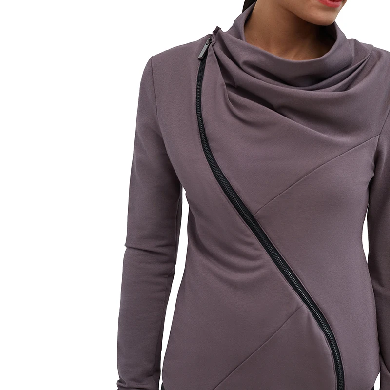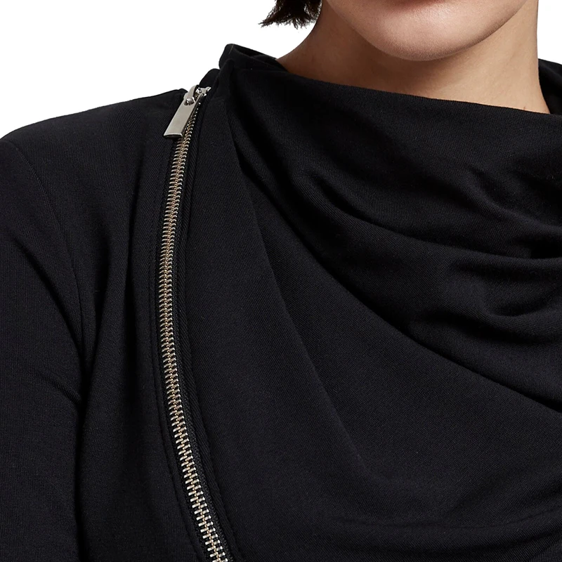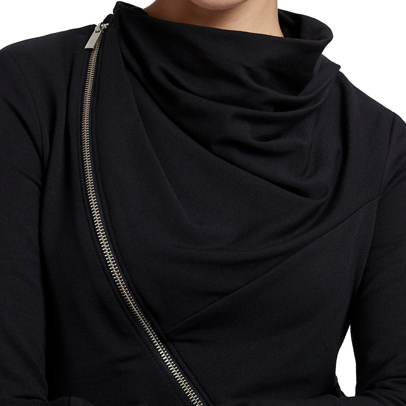 Two-way zipper, asymmetric, long sleeves with cuffs and thumbholes.