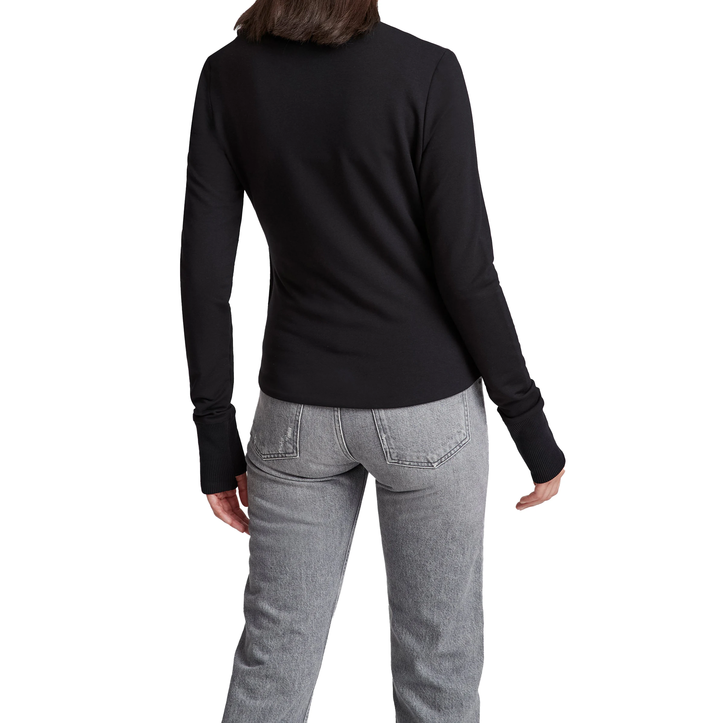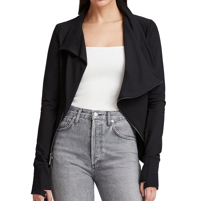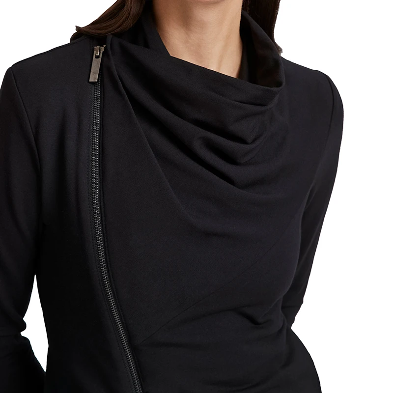 Two-way zipper, asymmetric, long sleeves with cuffs and thumbholes.