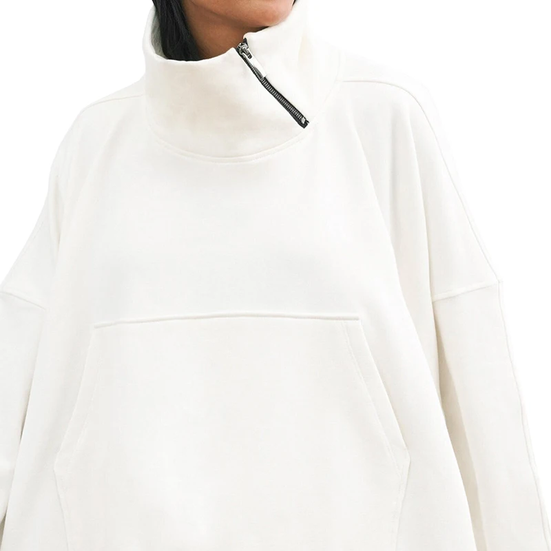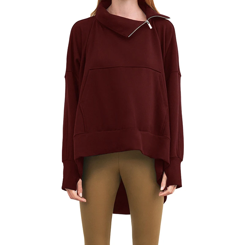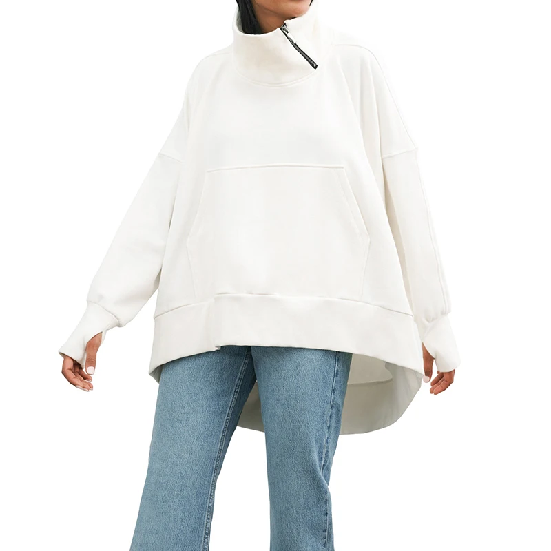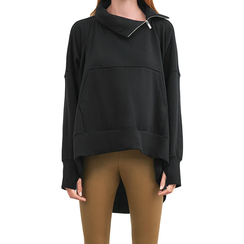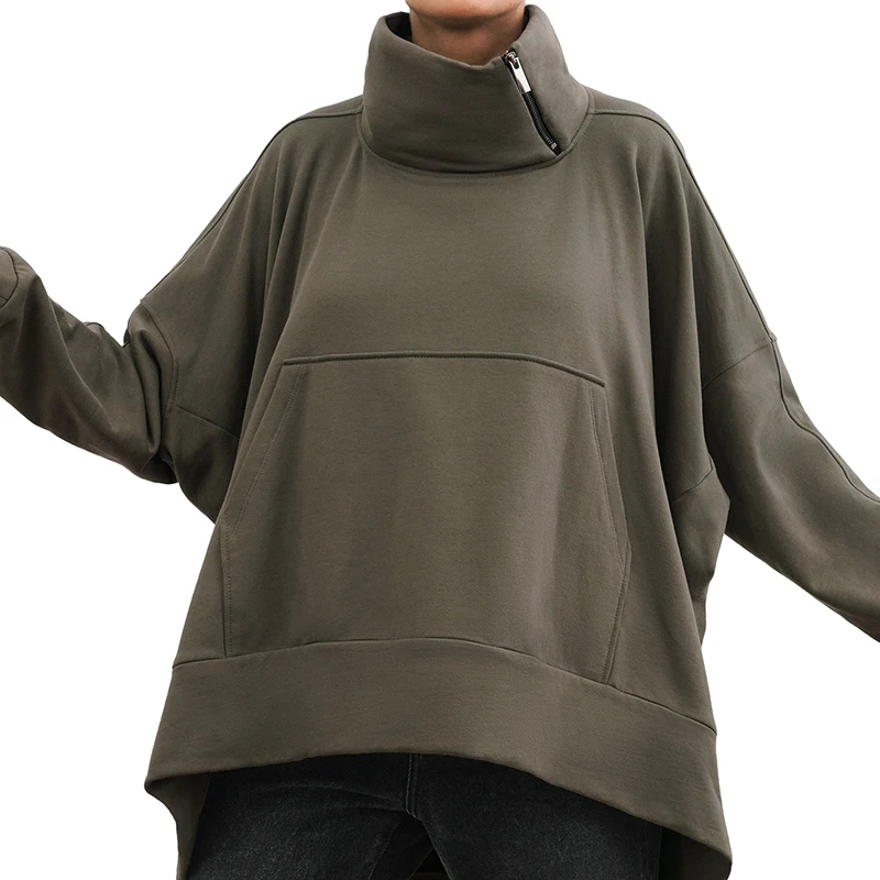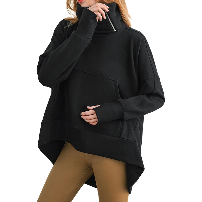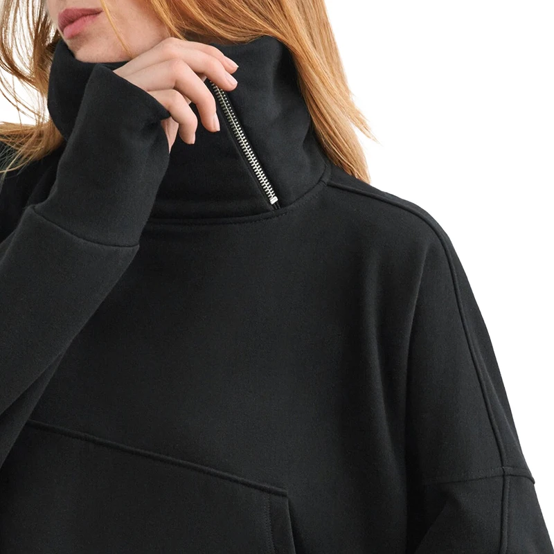 High neckline with metal zipper, long sleeves with thumbhole, oversized kangaroo pocket.