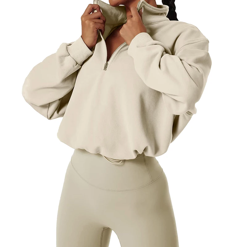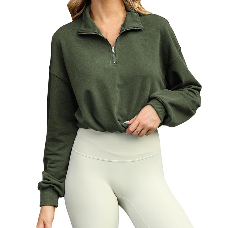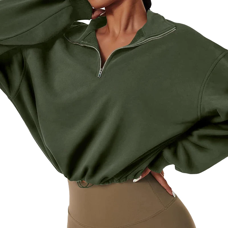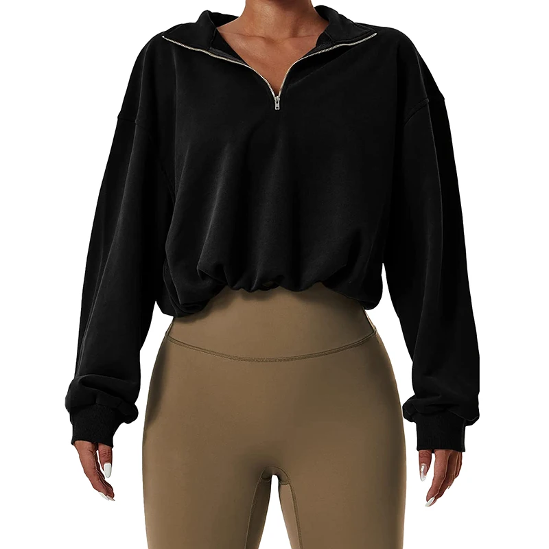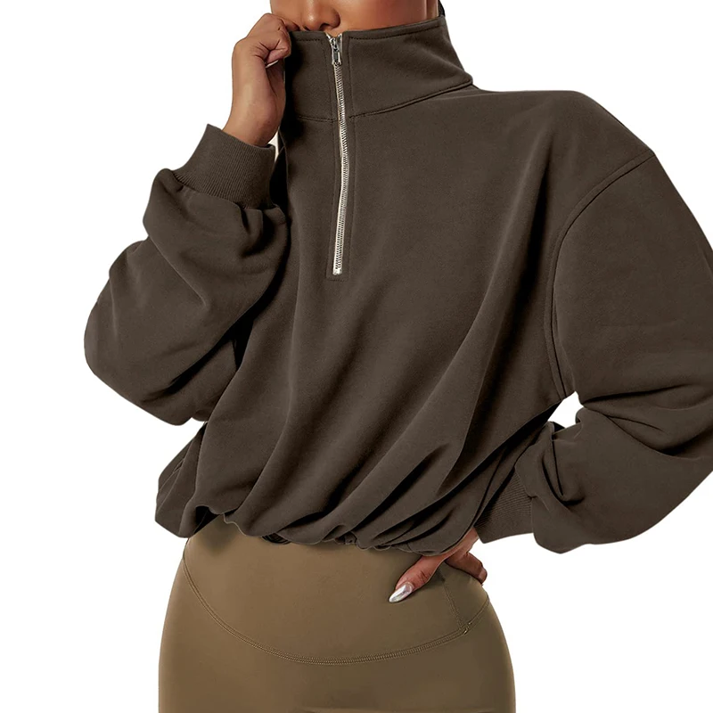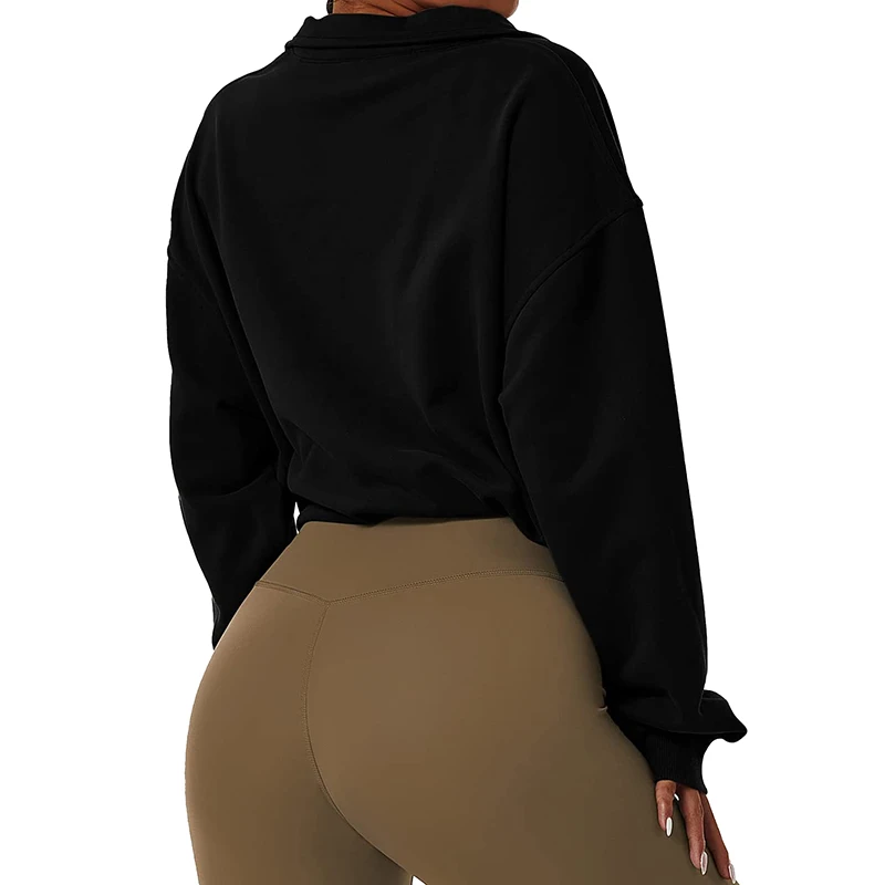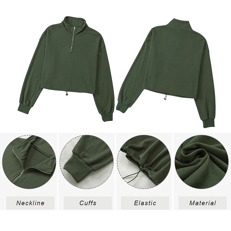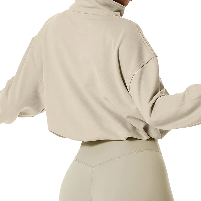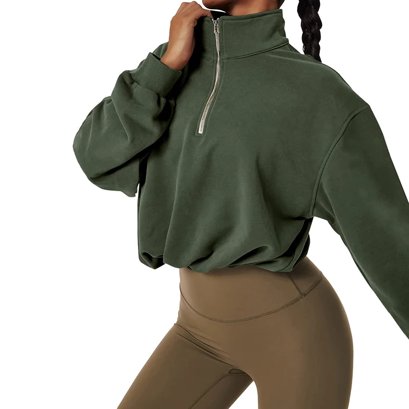 Half zip up, drop shoulder collar, loose fit, long sleeve, high neck.