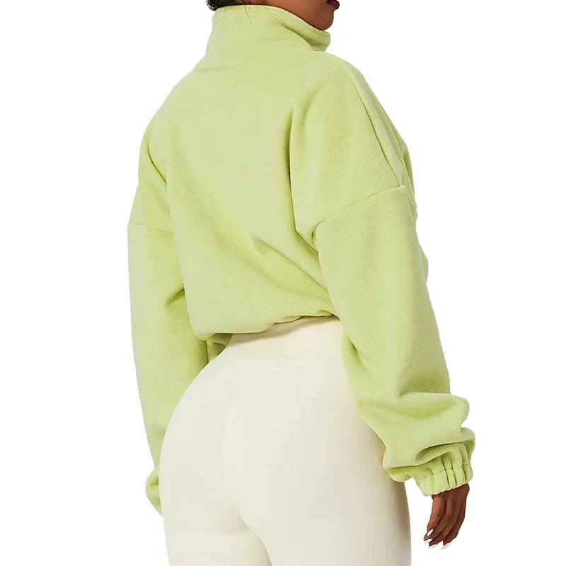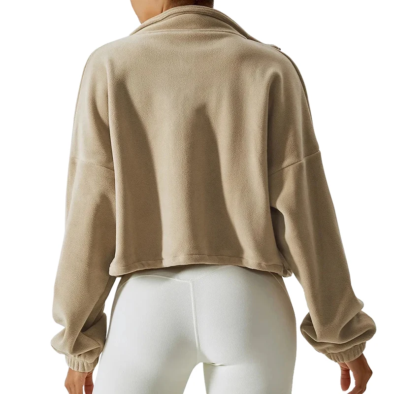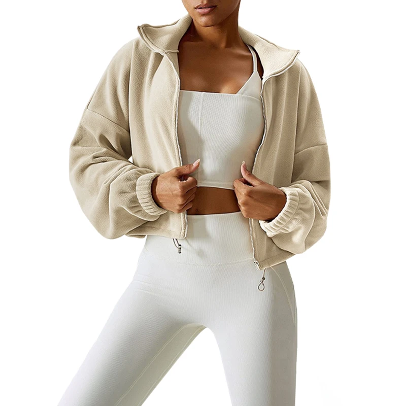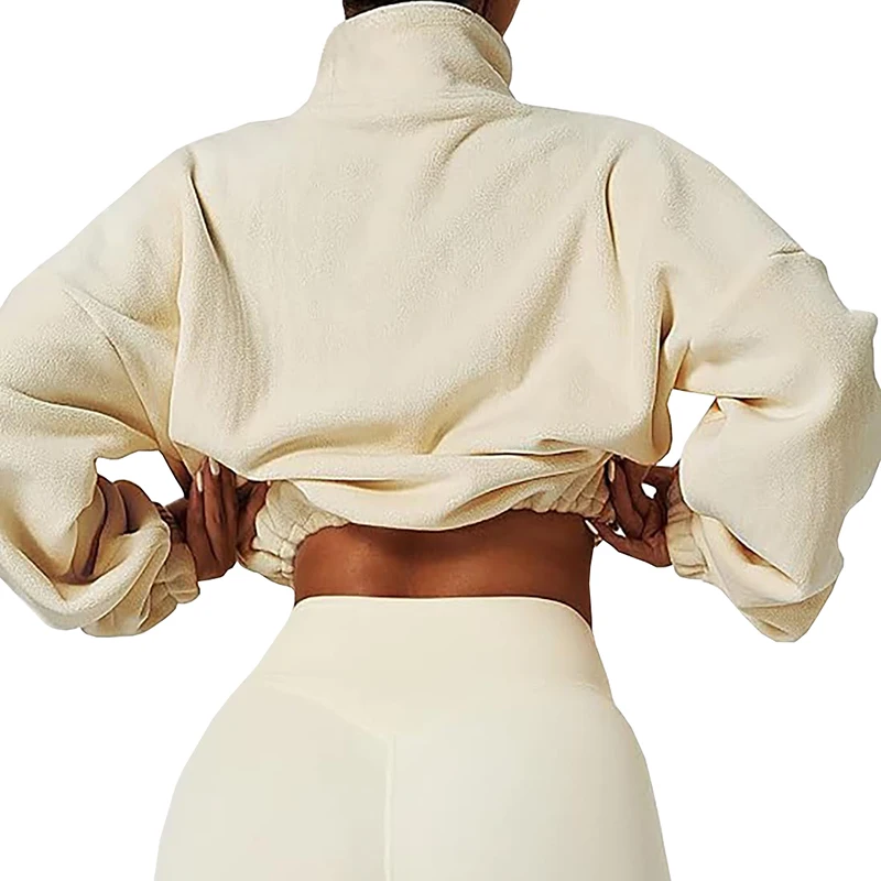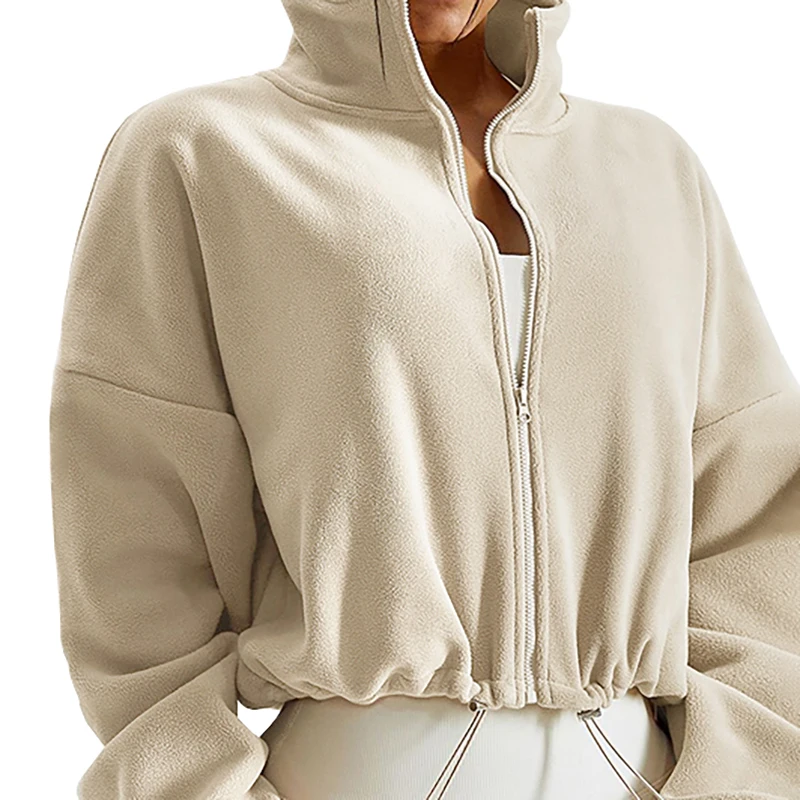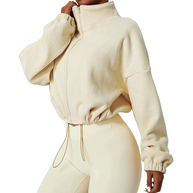 Long sleeve, crop length, oversize fit, lightweight, warm fleece, zip up, stand collar.