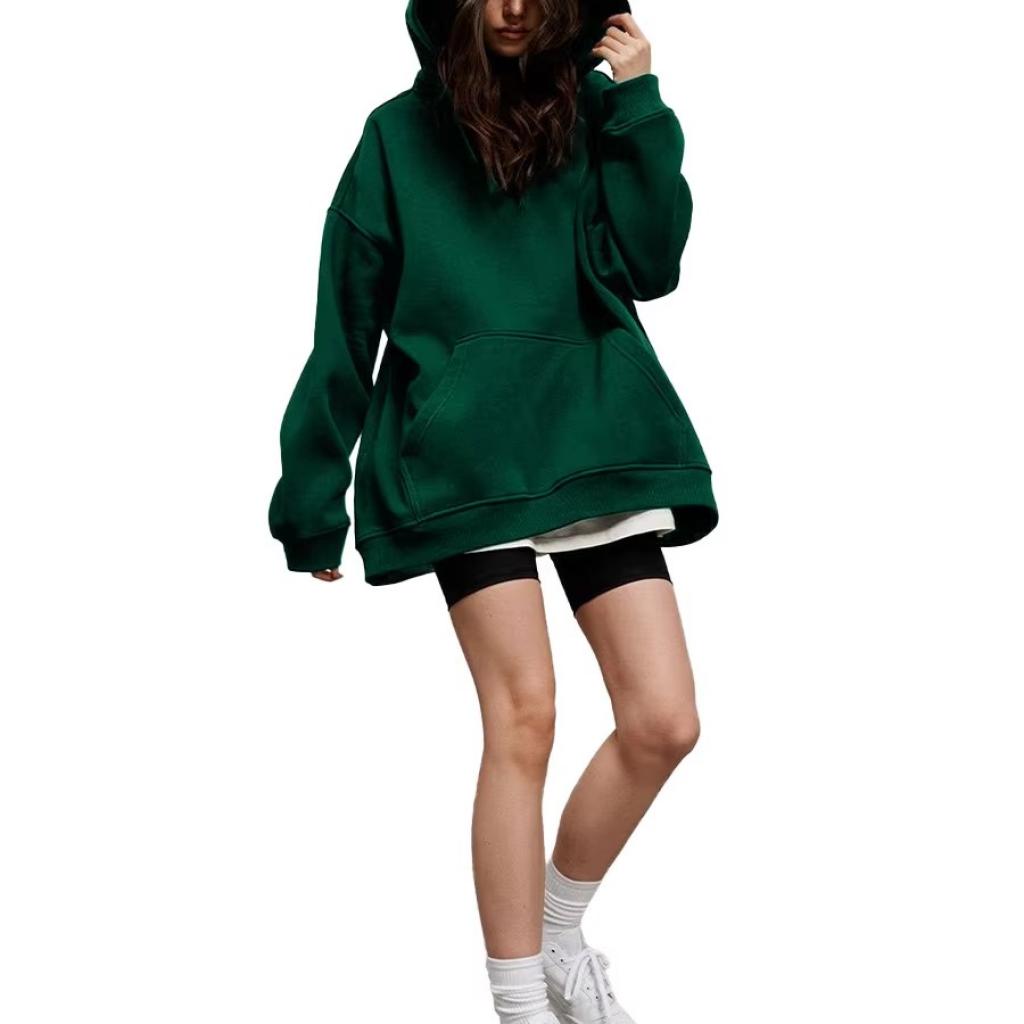 Solid color, long sleeve, dropped shoulder, hooded design, kangaroo pocket, very loose fit.